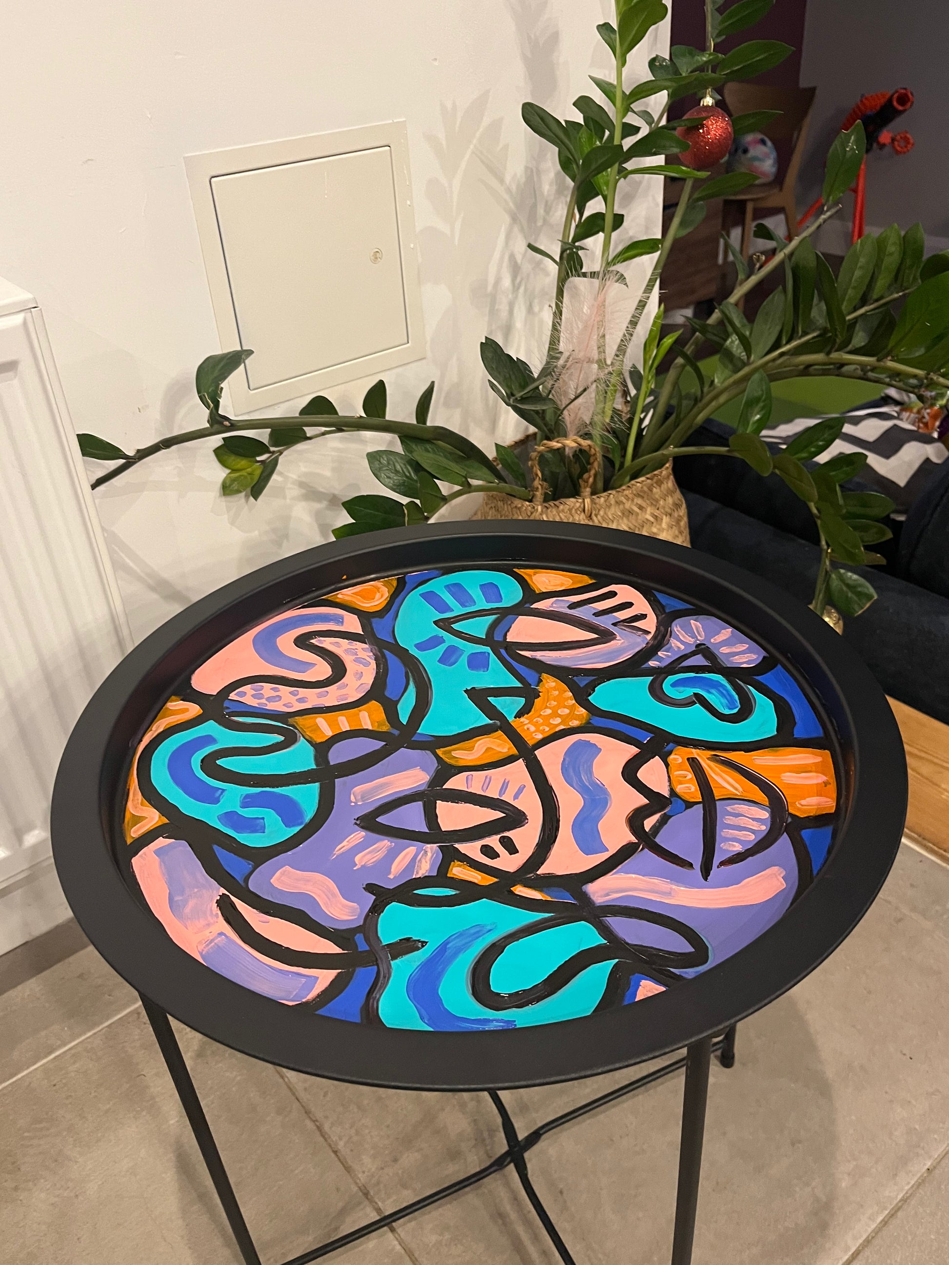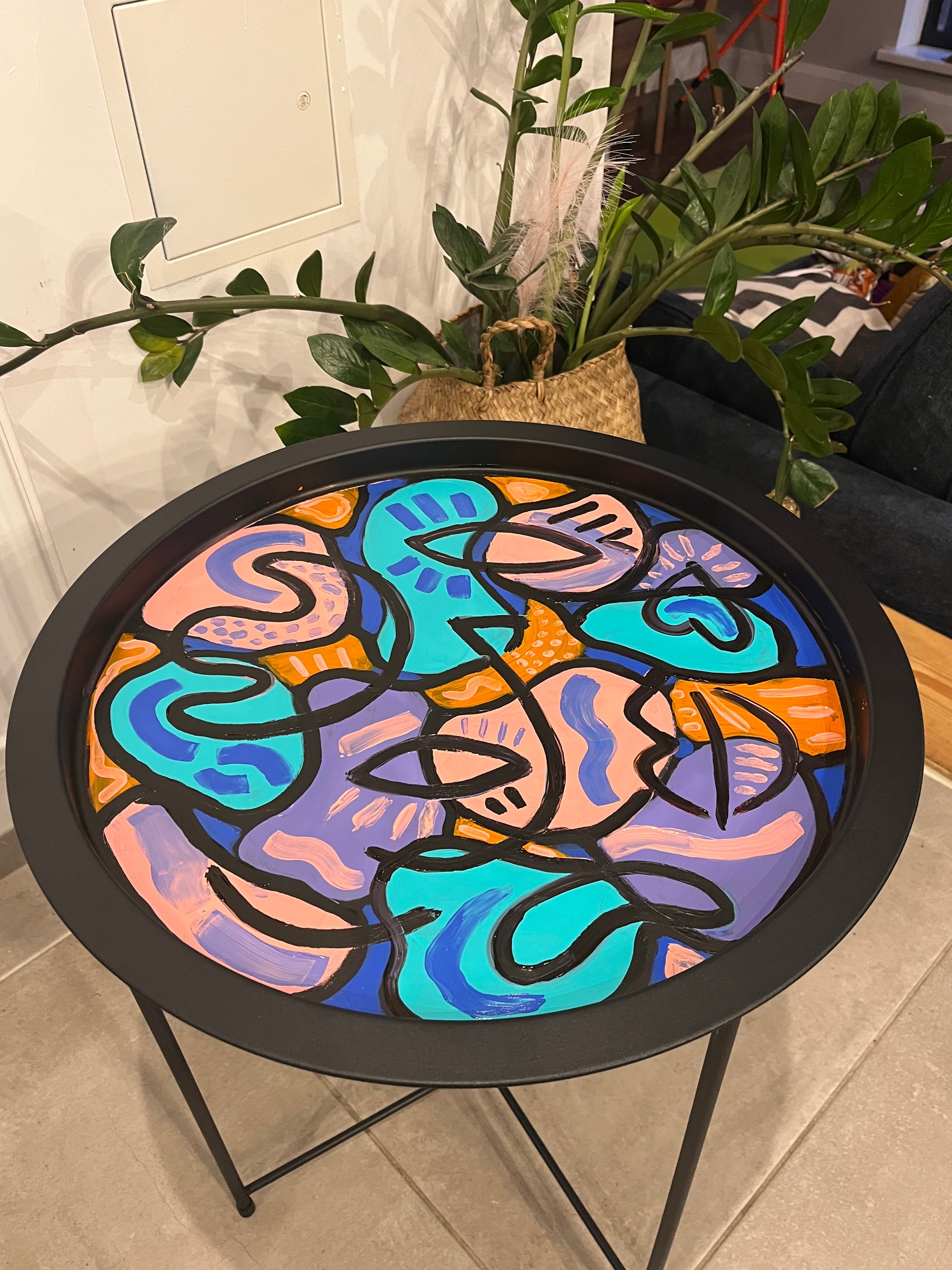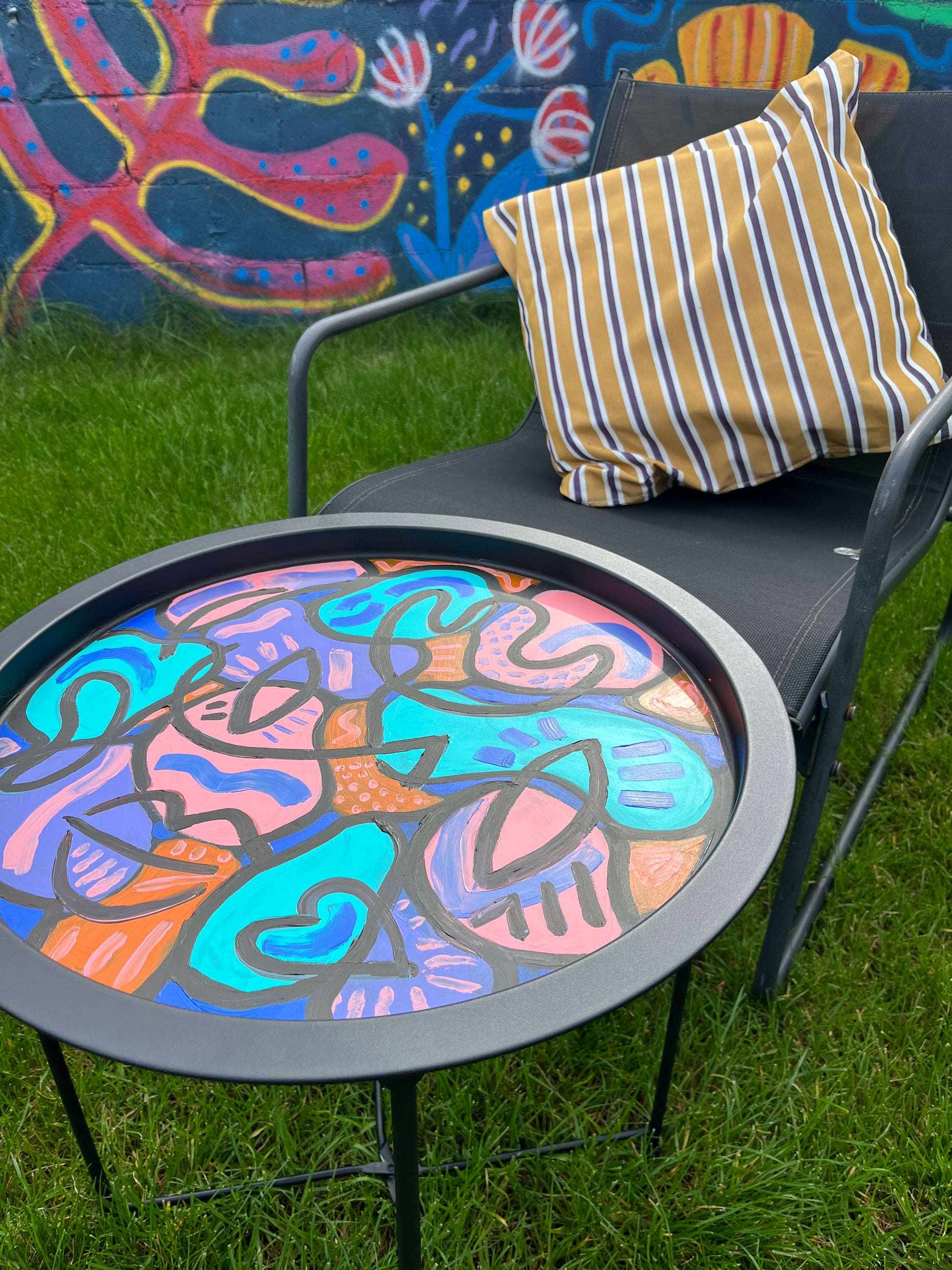 A stunningly hand-painted table that can be used both indoors and outdoors! With its vibrant abstract design, this table adds a pop of colour and style to any space. Plus, it's light, strong, and easily foldable for convenient storage.