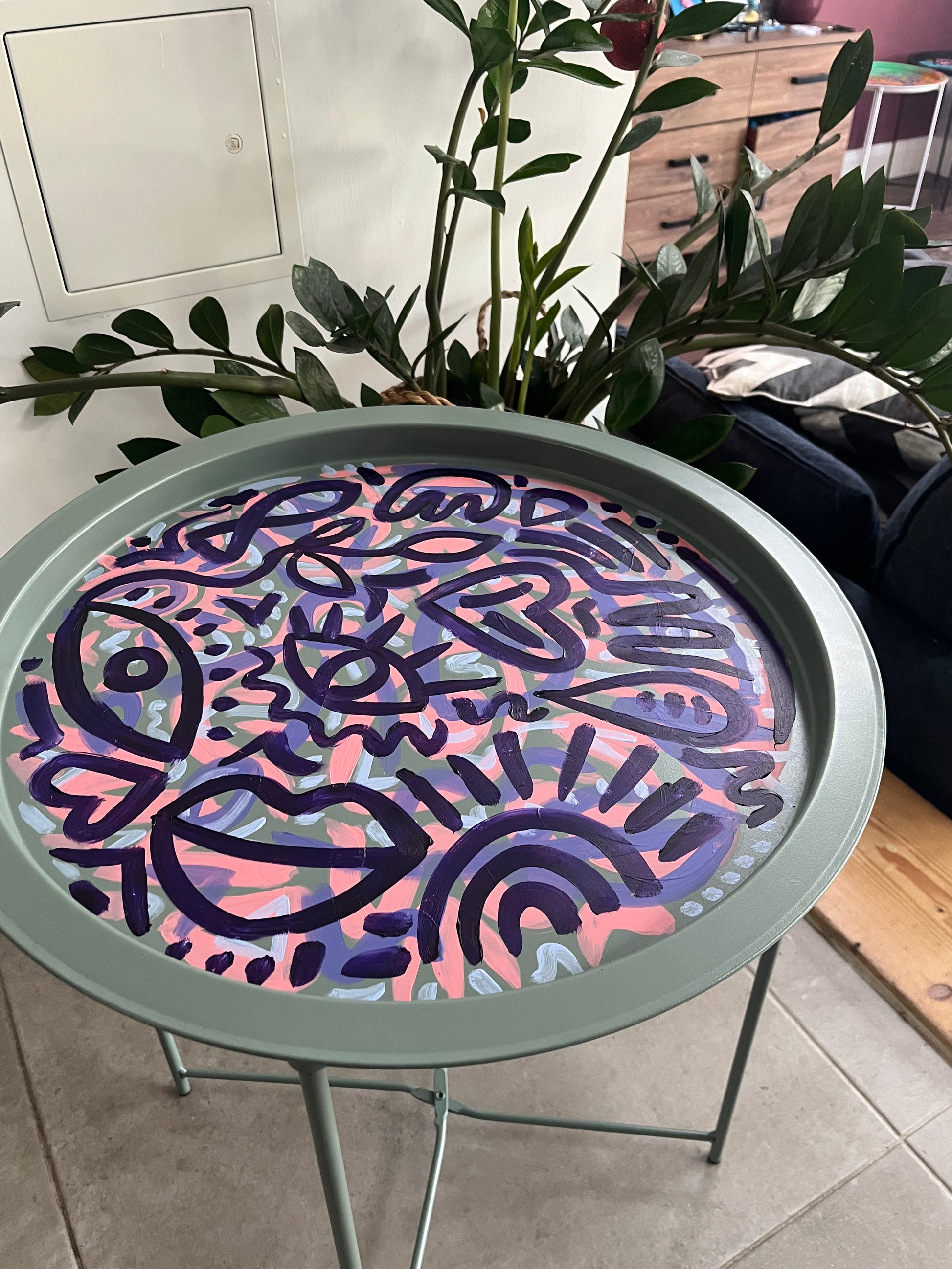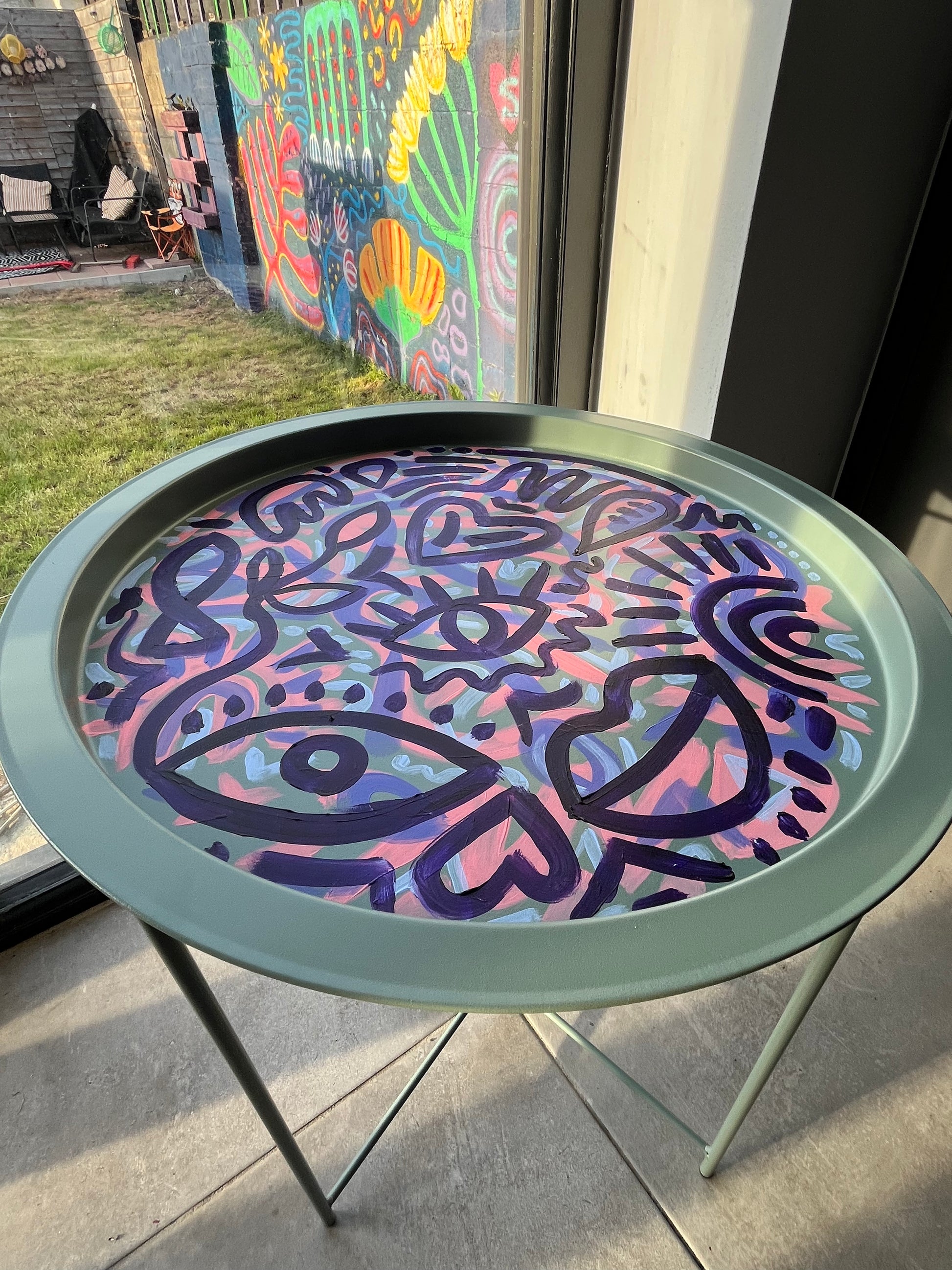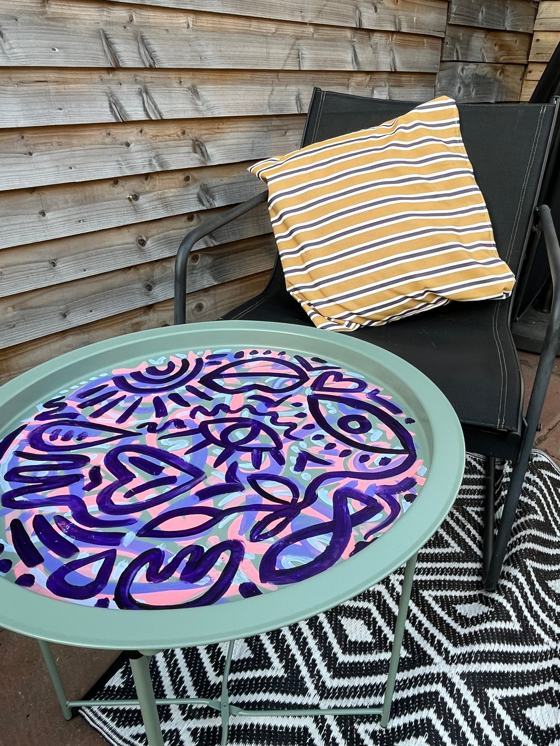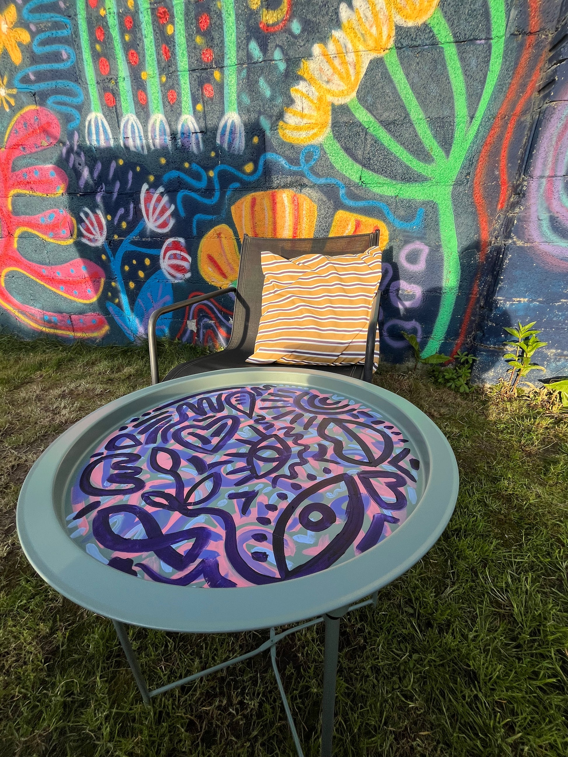 A stunningly hand-painted table that can be used both indoors and outdoors! With its vibrant abstract design, this table adds a pop of colour and style to any space. Plus, it's light, strong, and easily foldable for convenient storage.