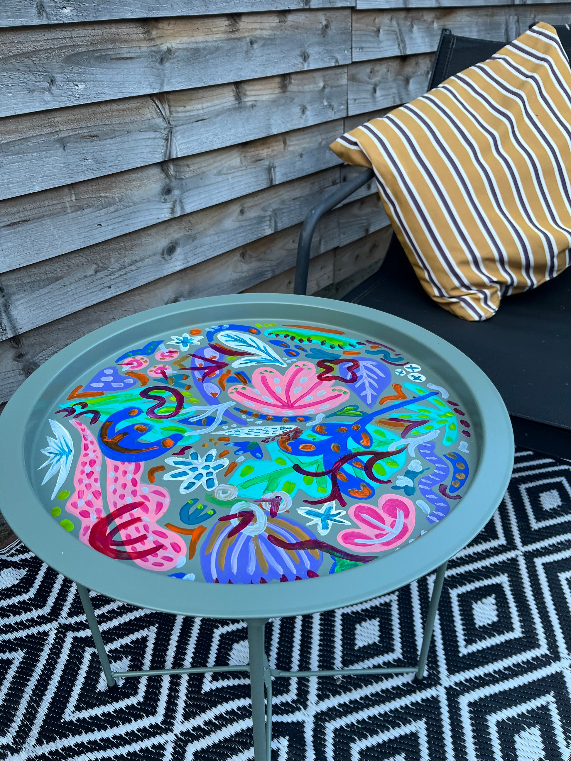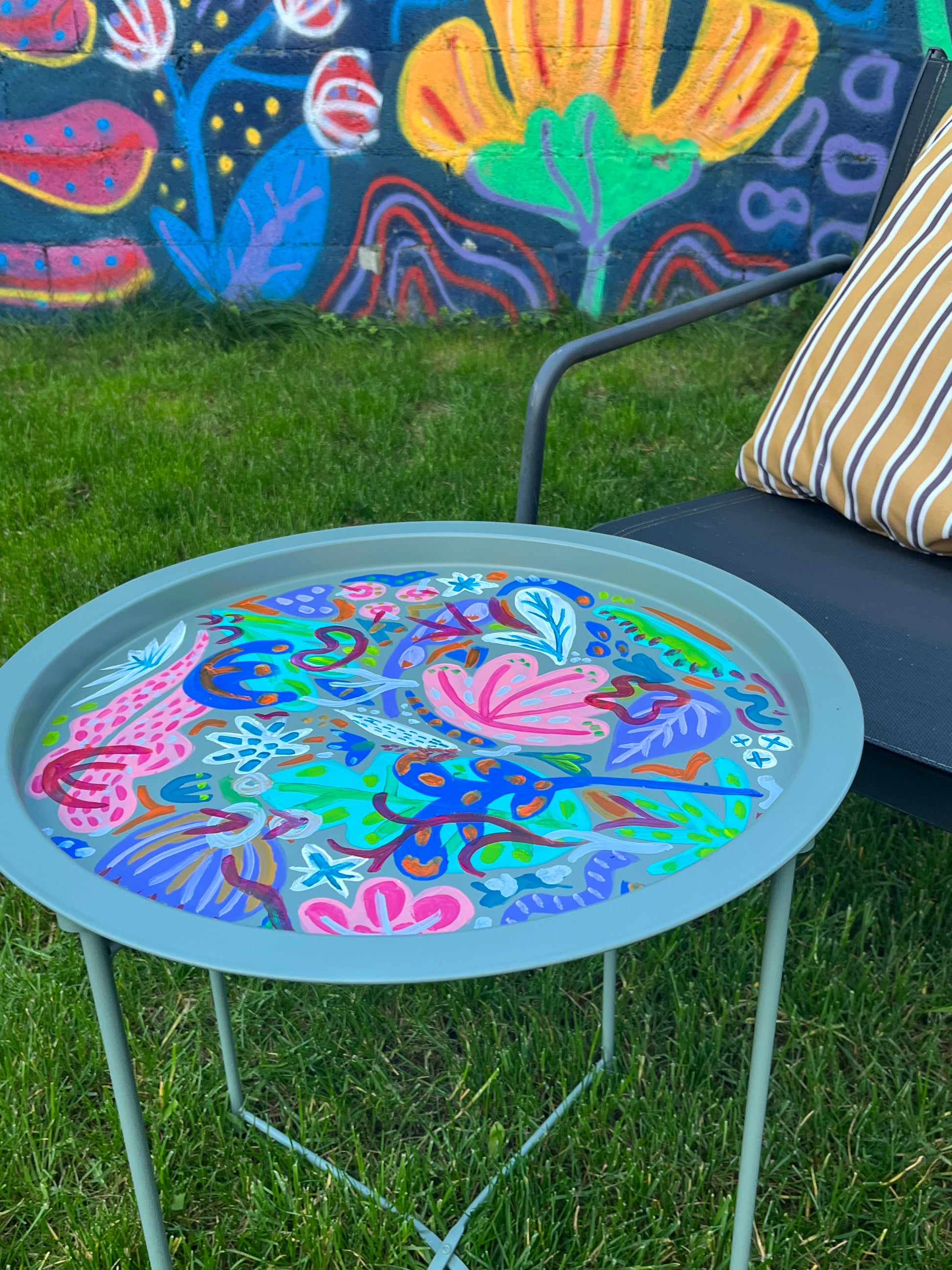 A stunningly handpainted table that can be used both indoors and outdoors! With its vibrant nature-inspired designs, this table adds a pop of color and style to any space. Plus, it's light, strong, and easily foldable for convenient storage.