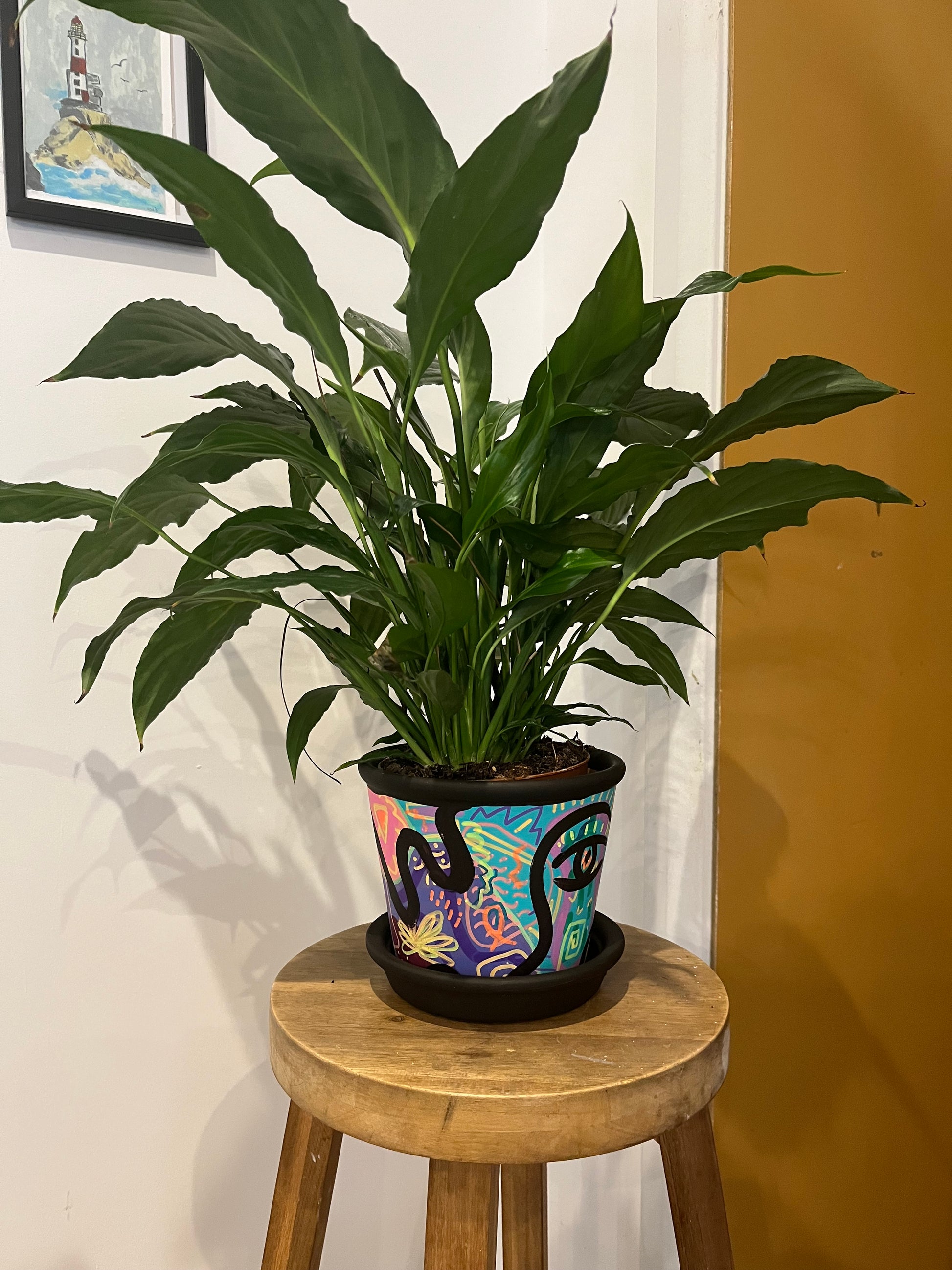 Add some colour and personality to your plants with a hand painted pot and saucer! The bold and modern design will make your greenery stand out. Made of terracotta, it's perfect for both indoor and outdoor use. Elevate your plant game with this unique piece!