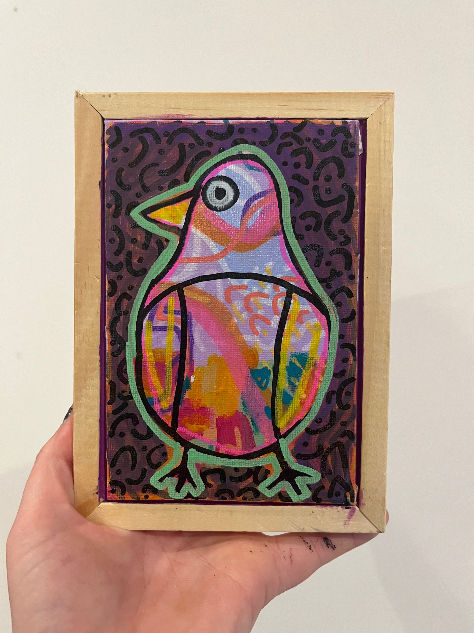 Meet Peig, one of four playful little birdies that will add a whimsical touch to any space. Made with acrylic and framed on canvas, she brings a unique twist to traditional wall art. Let this quirky and fun piece bring a smile to your face every day.