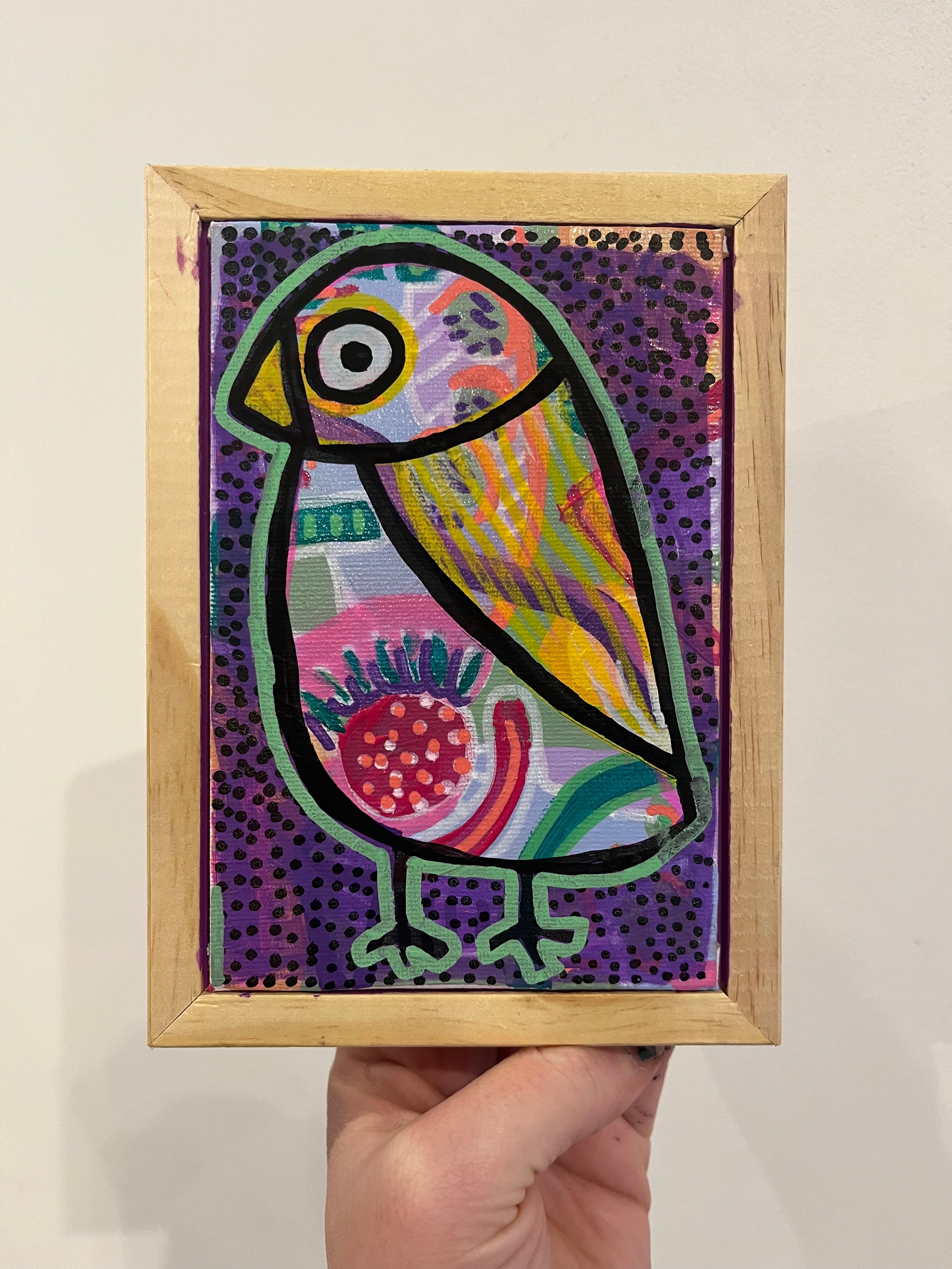 Meet Penelope, one of four playful little birdies that will add a whimsical touch to any space. Made with acrylic and framed on canvas, she brings a unique twist to traditional wall art. Let this quirky and fun piece bring a smile to your face every day.
