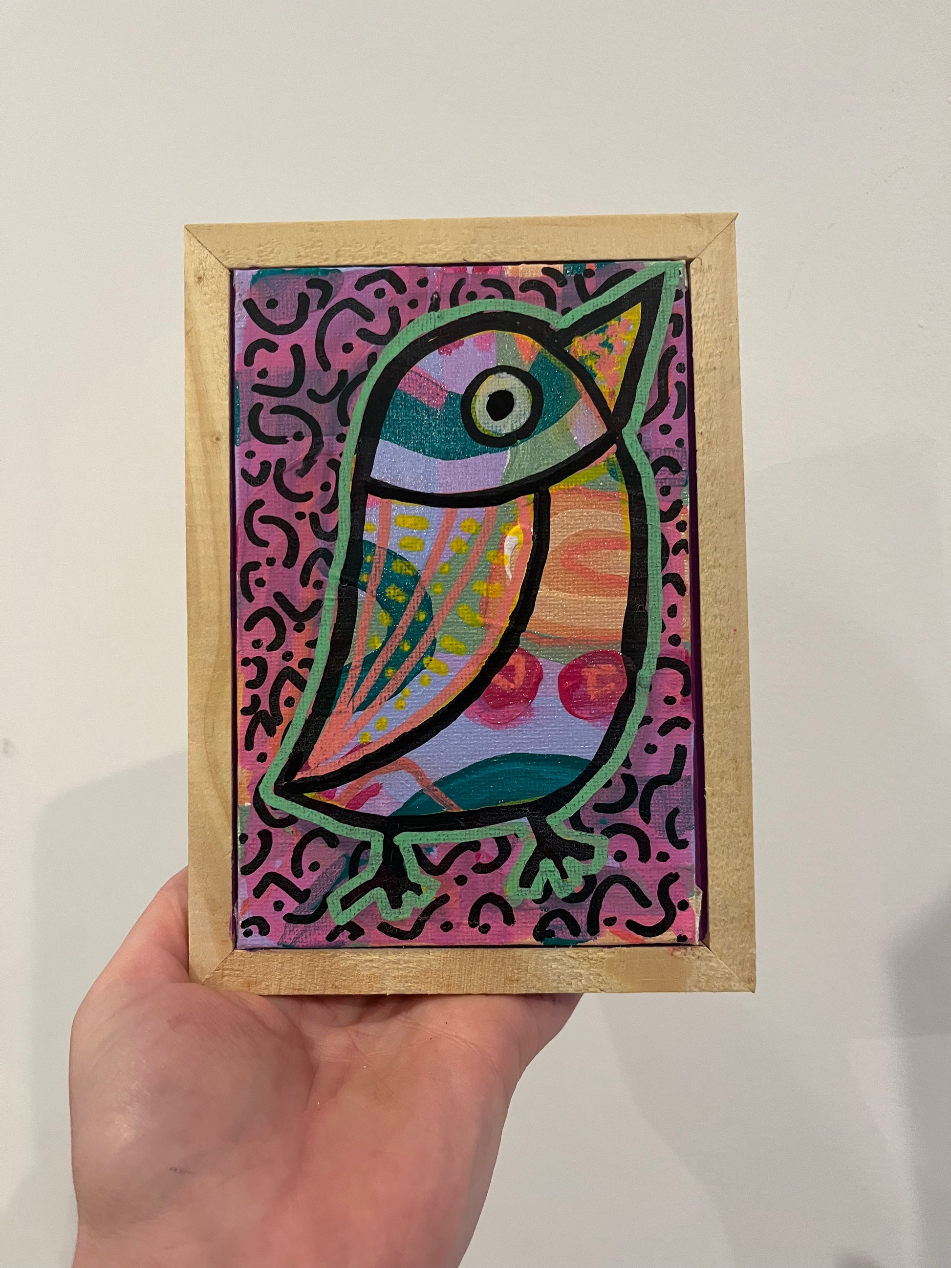 Meet Paula, one of four playful little birdies that will add a whimsical touch to any space. Made with acrylic and framed on canvas, she brings a unique twist to traditional wall art. Let this quirky and fun piece bring a smile to your face every day.